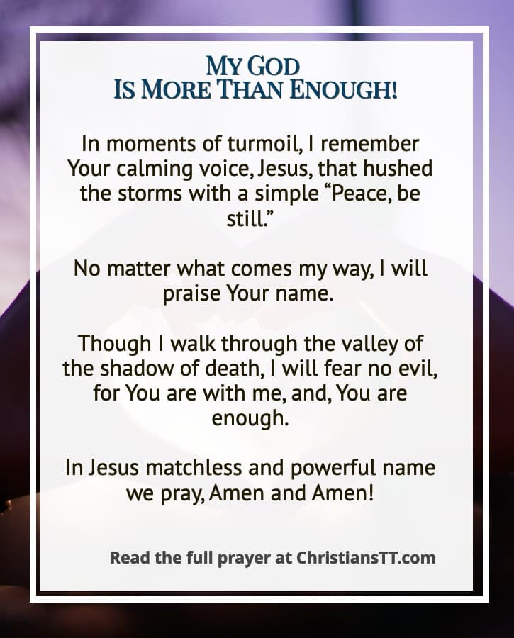 In moments of turmoil, I remember Your calming voice, Jesus, that hushed the storms with a simple “Peace, be still.” In You, I find a refuge that withstands any tempest, affirming that my God, You are more than enough.