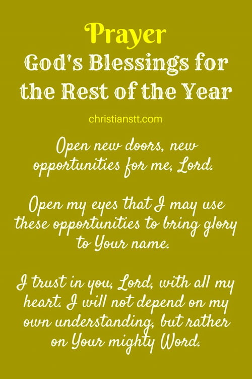 Lord, you know the plans you have for me and I know that they are plans to prosper and not harm me. Heavenly Father, I give you all thanks and praise for having brought me through the year so far. For the rest of the year, continue to pour out your blessings upon me in even greater measure.