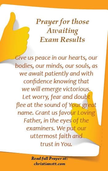 Heavenly Father, Thank you as I patiently await my exam results, help me to take away every spirit of anxiety and fear over this exam . I know that with you by my side I am victorious and triumphant, joy has come and I will scream for joy . May all Glory be given unto your Holy name . Amen ????