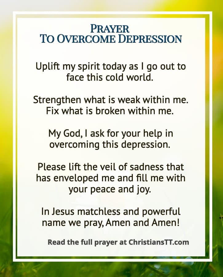 My God, I ask for your help in overcoming this depression. Please lift the veil of sadness that has enveloped me and fill me with your peace and joy. Remind me that I am fearfully and wonderfully made in your image, and that I have a purpose and a plan that you have designed for me.